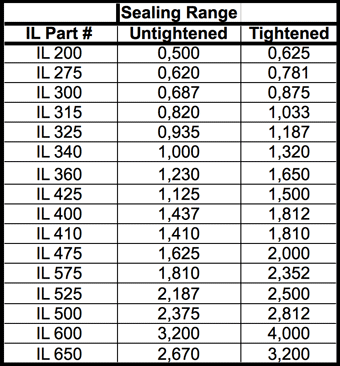 - 2. Using the Sealing Range given in the Yellow Box, find the appropriate IL Part # from the chart given to the right.