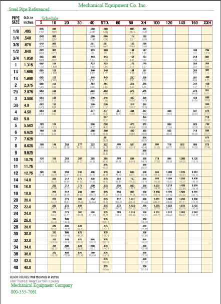 Across the top of the chart, the numbers reference the pipe schedule (or pipe thickness). At Mechanical Equipment, the most popular pipe sizes are Standard Weight, Schedule 40 or Schedule 80, which is used primarily for condensate return. The bold black number is the pipe OD and the gray number underneath is the weight per foot. Most of the time, you will only be looking for the pipe OD measurement, but the weight is here for you as well.