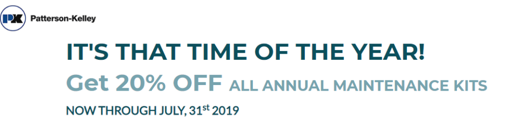 Hurry and don’t miss this opportunity to take 20% off Patterson-Kelley’s Annual Maintenance Kits. We’ve shared in the past why it is so important to perform annual maintenance as a way to build long-lasting customer relationships and add a consistent revenue stream for your business. In fact, here are 8 annual maintenance steps from Patterson-Kelley to help maintain energy efficiency and extend the life of your customers’ boilers.