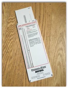 The PERMA-PIPE expansion chart will size expansion loops, locate anchor distances and tell you how much expansion per 100 feet to expect, under a given temperature or pressure, for both copper and steel. Keep it in your drawer or briefcase for easy access.
