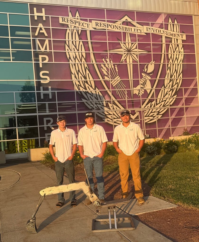 The team we sponsored included Aric Abbott, Jaden Sommers and Lou Jensen (the grandson of our very own Dean Powrozek). The team participated in several local and regional competitions, successfully advancing to each level before finally reaching the national competition. They were required to fabricate a backhoe loader bucket with a seat. The attached photo shows Aric, Jaden, and Lou with their finished piece.