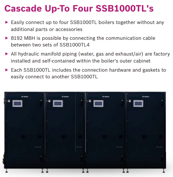 The 1,000 MBH modules are the MULTI-STACK of boilers. These modular condensing boilers can be “daisy-chained” together using the existing supply and return flanges that are shipped with caps on them, for a total capacity of up to 4,000 MBH. Easily connect up to four SSB1000TL together without any additional purchased venting parts or accessories.