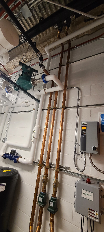 We recommended the KV Series Vertical Inline Pumps because they require no isolation pads and their simple, in-line design can save the customer money / energy. The controls are self-contained in the variable frequency drive which is wall mounted at eye level.
